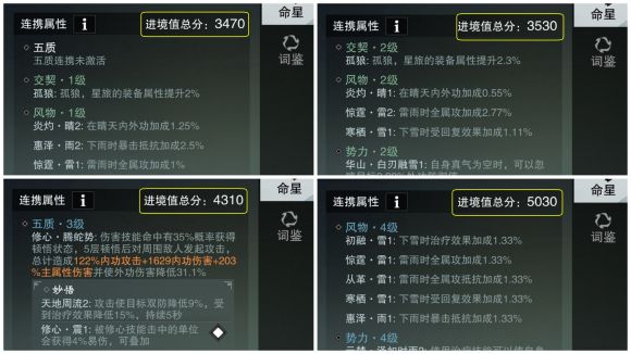 随着【进境值总分】的提升,【套装等级】也会随之提升,对套装属性(五质、交契、风物、势力)有比例加成。