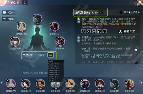 【进境值总分】:是左边所有卡片进境值之和,比如我图例这一套(这些卡片都还没有培养,是初始卡)1000+1000+770+770+770=4310