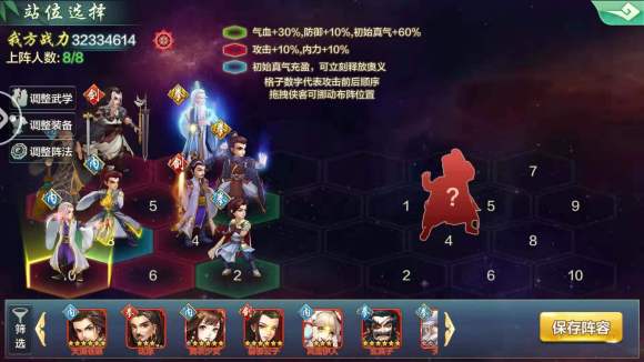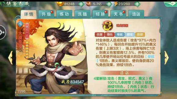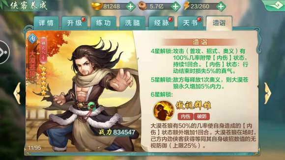 3、阵容养成,个人认为,大漠苍狼是体系侠客里较为海纳百川的一个,首先他不抢8号位,其次,不论是采取4拳王八阵给他留憋气空间(减少了他被奥义砸到的概率),还是采取3拳阵,还是2拳阵(互相伤害,依靠场上敌我减员给他预热的更快),他都能很好的适应,但是他需要的好伙伴还是得提一下的(尽量具备),王重阳(复活-给他更多憋气的资本)、扫地(没奶妈怎么打持久战)、达摩(提供被流弹蹭到后苍狼存活的概率)。