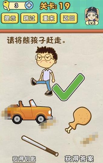 请将熊孩子赶走是《脑力达人全民烧脑游戏》第19关的问题,很多网友不知道答案是什么,下面小编给大家带来脑力达人全民烧脑游戏第19关攻略。