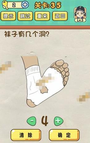 袜子有几个洞是《脑力达人全民烧脑游戏》第35关的问题,很多网友不知道答案是什么,下面小编给大家带来脑力达人全民烧脑游戏第35关攻略。 问题:袜子有几个洞? 答案:4处。 老友网www.andlaou.com免费为你分享