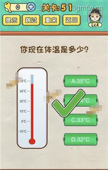 你现在体温是多少是《脑力达人全民烧脑游戏》第51关的问题,很多网友不知道答案是什么,下面小编给大家带来脑力达人全民烧脑游戏第51关攻略。 问题:你现在体温是多少? 答案:用手指一直按住体温计。 老友网www.andlaou.com免费为你分享