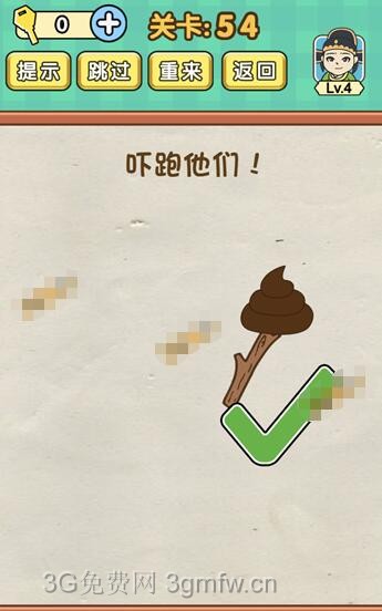吓跑他们是《脑力达人全民烧脑游戏》第54关的问题,很多网友不知道答案是什么,下面小编给大家带来脑力达人全民烧脑游戏第54关攻略。 问题:吓跑他们? 答案:移动便便在他们面前。 老友网www.andlaou.com免费为你分享