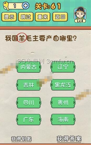 我国羊毛主要产自哪里是《脑力达人全民烧脑游戏》第61关的问题,很多网友不知道答案是什么,下面小编给大家带来脑力达人全民烧脑游戏第61关攻略。 问题:我国羊毛主要产自哪里? 答案:羊身上。 老友网www.andlaou.com免费为你分享