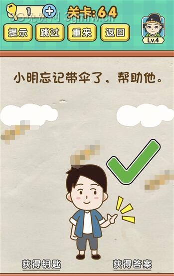 小明忘记带伞了帮助他是《脑力达人全民烧脑游戏》第64关的问题,很多网友不知道答案是什么,下面小编给大家带来脑力达人全民烧脑游戏第64关攻略。 问题:小明忘记带伞了帮助他? 答案:用手向两边拨开乌云。 老友网www.andlaou.com免费为你分享