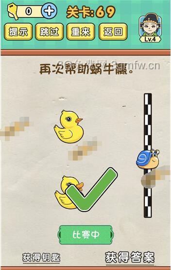 再次帮助蜗牛赢是《脑力达人全民烧脑游戏》第69关的问题,很多网友不知道答案是什么,下面小编给大家带来脑力达人全民烧脑游戏第69关攻略。 问题:再次帮助蜗牛赢? 答案:点击开始后,用手指按住两只小鸭。 老友网www.andlaou.com免费为你分享