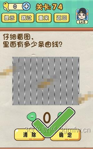 仔细看图里面有多少条曲线是《脑力达人全民烧脑游戏》第74关的问题,很多网友不知道答案是什么,下面小编给大家带来脑力达人全民烧脑游戏第74关攻略。 问题:仔细看图里面有多少条曲线? 答案:0。 老友网www.andlaou.com免费为你分享