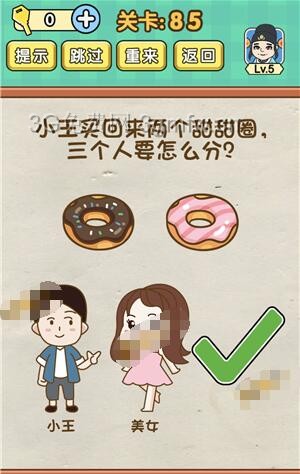 小王买回来两个甜甜圈三个人要怎么分是《脑力达人全民烧脑游戏》第85关的问题,很多网友不知道答案是什么,下面小编给大家带来脑力达人全民烧脑游戏第85关攻略。