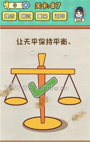 让天平保持平衡是《脑力达人全民烧脑游戏》第87关的问题,很多网友不知道答案是什么,下面小编给大家带来脑力达人全民烧脑游戏第87关攻略。 问题:让天平保持平衡? 答案:将所有东西都拿走。 老友网www.andlaou.com免费为你分享