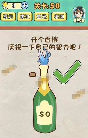 开个香槟庆祝一下自己的智力吧是《脑力达人全民烧脑游戏》第50关的问题,很多网友不知道答案是什么,下面小编给大家带来脑力达人全民烧脑游戏第50关攻略。