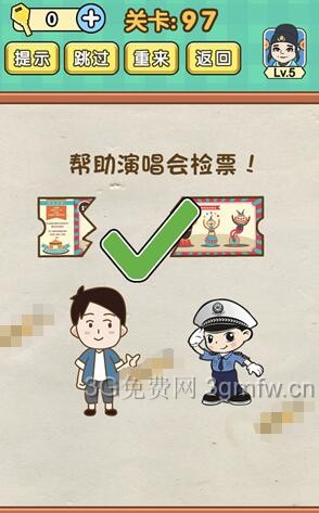 帮助演唱会检票是《脑力达人全民烧脑游戏》第97关的问题,很多网友不知道答案是什么,下面小编给大家带来脑力达人全民烧脑游戏第97关攻略。 问题:帮助演唱会检票? 答案:左右掰开票。 老友网www.andlaou.com免费为你分享