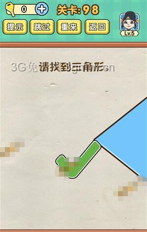 请找到三角形是《脑力达人全民烧脑游戏》第98关的问题,很多网友不知道答案是什么,下面小编给大家带来脑力达人全民烧脑游戏第98关攻略。 问题:请找到三角形? 答案:如上图所示。 老友网www.andlaou.com免费为你分享