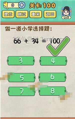 做一道小学选择题:66+34=?是《脑力达人全民烧脑游戏》第100关的问题,很多网友不知道答案是什么,下面小编给大家带来脑力达人全民烧脑游戏第100关攻略。