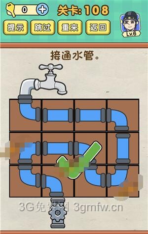 接通水管是《脑力达人全民烧脑游戏》第108关的问题,很多网友不知道答案是什么,下面小编给大家带来脑力达人全民烧脑游戏第108关攻略。 问题:接通水管? 答案:如上图所示。 老友网www.andlaou.com免费为你分享