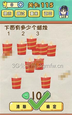 下面有多少个蜡烛是《脑力达人全民烧脑游戏》第115关的问题,很多网友不知道答案是什么,下面小编给大家带来脑力达人全民烧脑游戏第115关攻略。 问题:下面有多少个蜡烛? 答案:10。 老友网www.andlaou.com免费为你分享