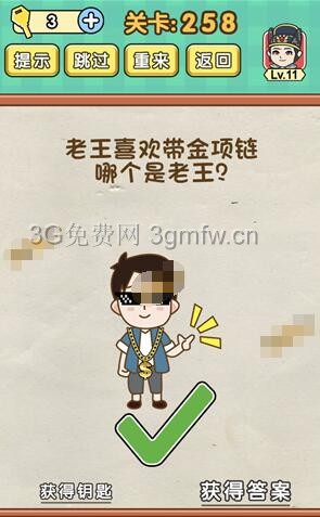 老王喜欢带金项链哪个是老王是《脑力达人全民烧脑游戏》第258关的问题,很多网友不知道答案是什么,下面小编给大家带来脑力达人全民烧脑游戏第258关攻略。