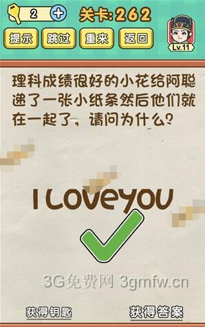 理科成绩很好的小花给阿聪递了一张纸条他们就在一起了请问为什么是《脑力达人全民烧脑游戏》第262关的问题,很多网友不知道答案是什么,下面小编给大家带来脑力达人全民烧脑游戏第262关攻略。