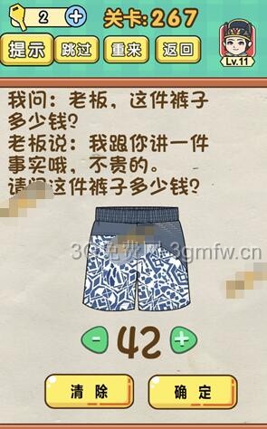 请问这件裤子多少钱是《脑力达人全民烧脑游戏》第267关的问题,很多网友不知道答案是什么,下面小编给大家带来脑力达人全民烧脑游戏第267关攻略。 问题:请问这件裤子多少钱? 答案:42。 老友网www.andlaou.com免费为你分享