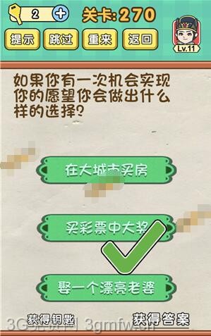 如果你有一次机会实现你的愿望你会做出什么样的选择是《脑力达人全民烧脑游戏》第270关的问题,很多网友不知道答案是什么,下面小编给大家带来脑力达人全民烧脑游戏第270关攻略。
