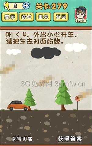 ph<4外出小心开车请把车去对面站牌是《脑力达人全民烧脑游戏》第279关的问题,很多网友不知道答案是什么,下面小编给大家带来脑力达人全民烧脑游戏第279关攻略。