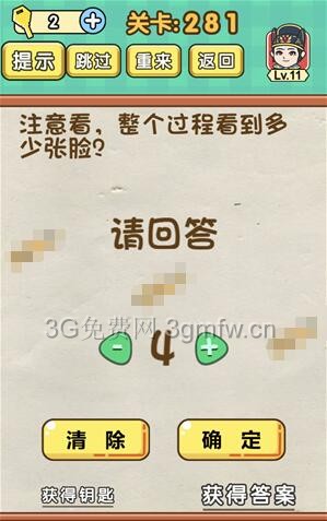 注意看整个过程看到多少张脸是《脑力达人全民烧脑游戏》第281关的问题,很多网友不知道答案是什么,下面小编给大家带来脑力达人全民烧脑游戏第281关攻略。 问题:注意看整个过程看到多少张脸? 答案:4。 老友网www.andlaou.com免费为你分享