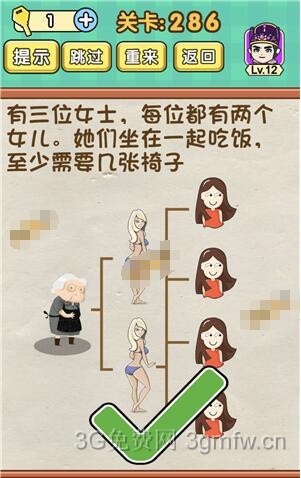 有三位女士每位都有两个女儿,他们坐在一起吃饭,至少需要几张椅子是《脑力达人全民烧脑游戏》第286关的问题,很多网友不知道答案是什么,下面小编给大家带来脑力达人全民烧脑游戏第286关攻略。