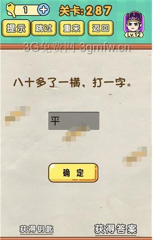 八十多了一横打一字是《脑力达人全民烧脑游戏》第287关的问题,很多网友不知道答案是什么,下面小编给大家带来脑力达人全民烧脑游戏第287关攻略。 问题:八十多了一横打一字? 答案:平。 老友网www.andlaou.com免费为你分享