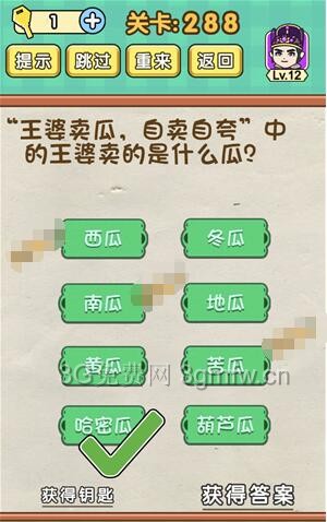 王婆卖瓜自卖自夸王婆卖的是什么瓜案是《脑力达人全民烧脑游戏》第288关的问题,很多网友不知道答案是什么,下面小编给大家带来脑力达人全民烧脑游戏第288关攻略。