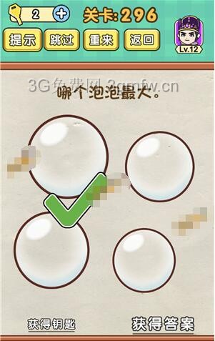 哪个泡泡最大是《脑力达人全民烧脑游戏》第296关的问题,很多网友不知道答案是什么,下面小编给大家带来脑力达人全民烧脑游戏第296关攻略。 问题:哪个泡泡最大? 答案:放大每个泡泡。 老友网www.andlaou.com免费为你分享