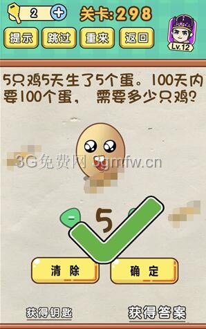 5个鸡蛋5天生了5个蛋100天内要100个蛋需要多少只鸡是《脑力达人全民烧脑游戏》第298关的问题,很多网友不知道答案是什么,下面小编给大家带来脑力达人全民烧脑游戏第298关攻略。