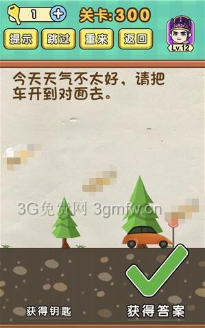 今天天气不太好请把车开到对面去是《脑力达人全民烧脑游戏》第300关的问题,很多网友不知道答案是什么,下面小编给大家带来脑力达人全民烧脑游戏第300关攻略。