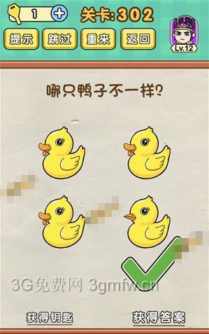 哪只鸭子不一样是《脑力达人全民烧脑游戏》第302关的问题,很多网友不知道答案是什么,下面小编给大家带来脑力达人全民烧脑游戏第302关攻略。 问题:哪只鸭子不一样? 答案:移开最后一只鸭子的嘴巴。 老友网www.andlaou.com免费为你分享