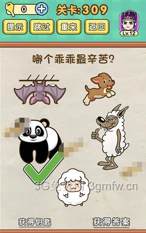 哪个乖乖最辛苦是《脑力达人全民烧脑游戏》第309关的问题,很多网友不知道答案是什么,下面小编给大家带来脑力达人全民烧脑游戏第309关攻略。 问题:哪个乖乖最辛苦? 答案:熊猫。 老友网www.andlaou.com免费为你分享