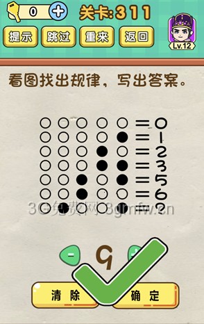 看图找出规律写出答案是《脑力达人全民烧脑游戏》第311关的问题,很多网友不知道答案是什么,下面小编给大家带来脑力达人全民烧脑游戏第311关攻略。 问题:看图找出规律写出答案? 答案:9,二进制。 老友网www.andlaou.com免费为你分享