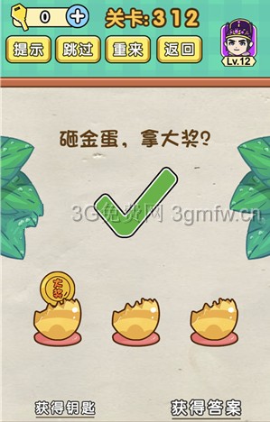 敲金蛋拿大奖是《脑力达人全民烧脑游戏》第312关的问题,很多网友不知道答案是什么,下面小编给大家带来脑力达人全民烧脑游戏第312关攻略。 问题:敲金蛋拿大奖? 答案:移动右边绿叶下的锤子敲击金蛋。 老友网www.andlaou.com免费为你分享