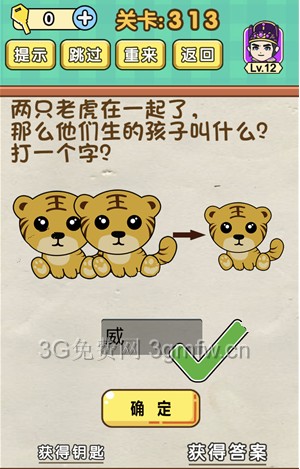 两只老虎在一起了那么它们生的孩子打一个字是《脑力达人全民烧脑游戏》第313关的问题,很多网友不知道答案是什么,下面小编给大家带来脑力达人全民烧脑游戏第313关攻略。