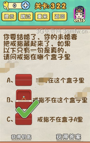 你要结婚了,你的未婚妻把戒指藏起来了。如果以下只有一句话是真的,请问戒指在哪个盒子里是《脑力达人全民烧脑游戏》第322关的问题,很多网友不知道答案是什么,下面小编给大家带来脑力达人全民烧脑游戏第322关攻略。