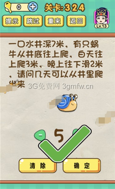 一口水井深7米,有只蜗牛从井底往上爬,白天往爬3米,晚上往下滑2米,请问几天可以从井里爬出来是《脑力达人全民烧脑游戏》第324关的问题,很多网友不知道答案是什么,下面小编给大家带来脑力达人全民烧脑游戏第324关攻略。