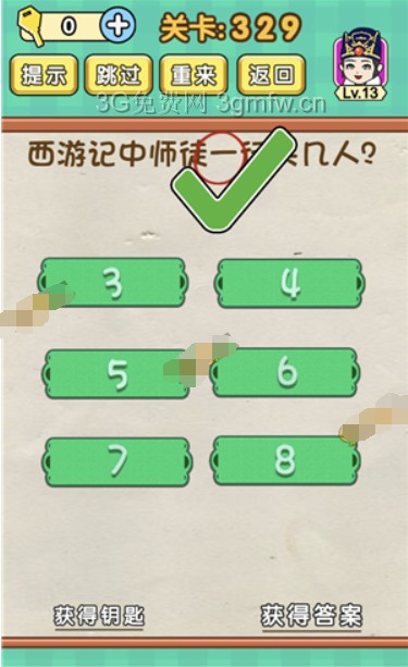 西游记中师徒一行有几人是《脑力达人全民烧脑游戏》第329关的问题,很多网友不知道答案是什么,下面小编给大家带来脑力达人全民烧脑游戏第329关攻略。