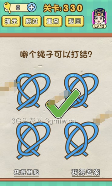 哪个绳子可以打结是《脑力达人全民烧脑游戏》第330关的问题,很多网友不知道答案是什么,下面小编给大家带来脑力达人全民烧脑游戏第330关攻略。 问题:哪个绳子可以打结? 答案:第一个绳子。 老友网www.andlaou.com免费为你分享
