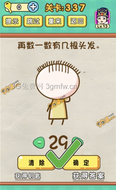 再数一数有几根头发是《脑力达人全民烧脑游戏》第337关的问题,很多网友不知道答案是什么,下面小编给大家带来脑力达人全民烧脑游戏第337关攻略。 问题:再数一数有几根头发? 答案:29。 老友网www.andlaou.com免费为你分享