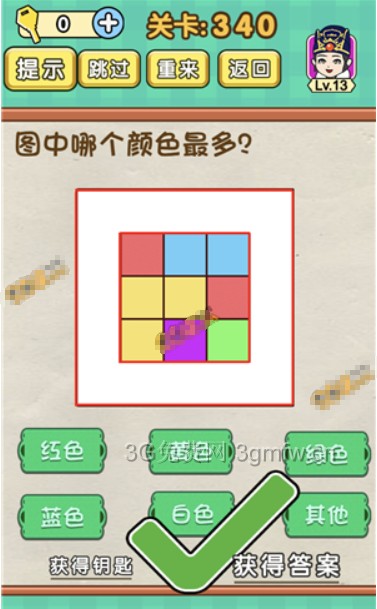 图中哪个颜色最多是《脑力达人全民烧脑游戏》第340关的问题,很多网友不知道答案是什么,下面小编给大家带来脑力达人全民烧脑游戏第340关攻略。 问题:图中哪个颜色最多? 答案:白色。 老友网www.andlaou.com免费为你分享