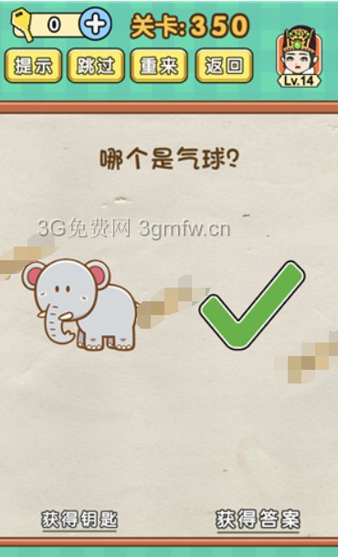 哪个是气球是《脑力达人全民烧脑游戏》第350关的问题,很多网友不知道答案是什么,下面小编给大家带来脑力达人全民烧脑游戏第350关攻略。 问题:哪个是气球? 答案:放大右边的大象。 老友网www.andlaou.com免费为你分享
