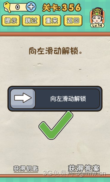 向左滑动解锁是《脑力达人全民烧脑游戏》第356关的问题,很多网友不知道答案是什么,下面小编给大家带来脑力达人全民烧脑游戏第356关攻略。 问题:向左滑动解锁? 答案:看清楚!!!向左滑动。 老友网www.andlaou.com免费为你分享