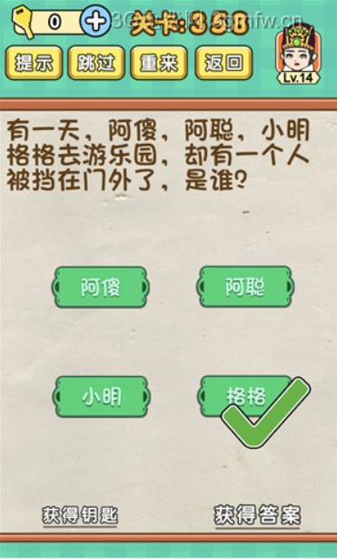 有一天,阿傻,阿聪,小明和格格去游乐园,却有一个人被挡在门外了,是谁是《脑力达人全民烧脑游戏》第358关的问题,很多网友不知道答案是什么,下面小编给大家带来脑力达人全民烧脑游戏第358关攻略。