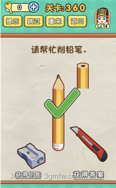 怎么削铅笔是《脑力达人全民烧脑游戏》第360关的问题,很多网友不知道答案是什么,下面小编给大家带来脑力达人全民烧脑游戏第360关攻略。 问题:怎么削铅笔? 答案:移开上半部分。 老友网www.andlaou.com免费为你分享
