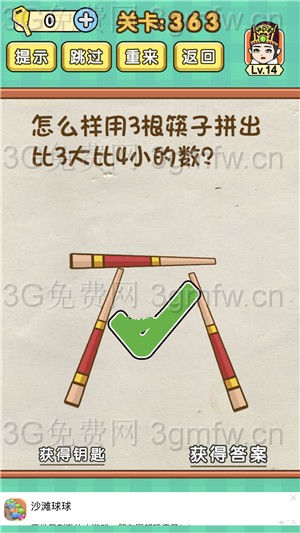 怎么样用3根筷子拼出比3大比4小的数是《脑力达人全民烧脑游戏》第363关的问题,很多网友不知道答案是什么,下面小编给大家带来脑力达人全民烧脑游戏第363关攻略。
