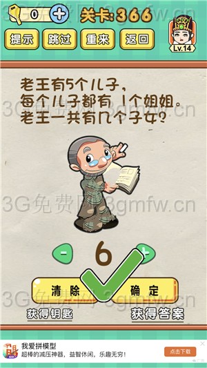 老王有5个儿子,每个儿子都有1个姐姐,老王一共有几个子女是《脑力达人全民烧脑游戏》第366关的问题,很多网友不知道答案是什么,下面小编给大家带来脑力达人全民烧脑游戏第366关攻略。