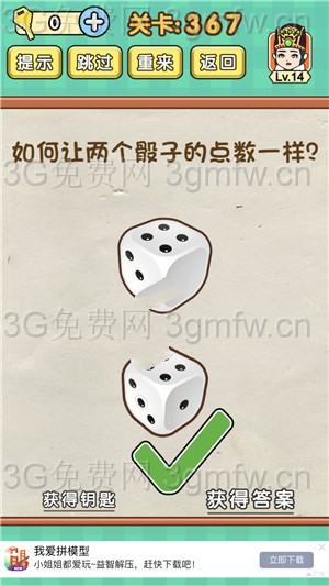 如何让两个骰子的点数一样是《脑力达人全民烧脑游戏》第367关的问题,很多网友不知道答案是什么,下面小编给大家带来脑力达人全民烧脑游戏第367关攻略。