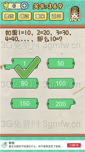 如果1=10,2=20,3=30......那么10=?是《脑力达人全民烧脑游戏》第369关的问题,很多网友不知道答案是什么,下面小编给大家带来脑力达人全民烧脑游戏第369关攻略。
